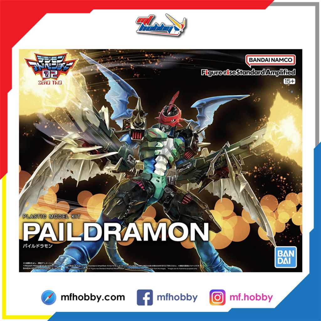 Paildramon from "Digimon Adventure 02" appears in a new "Figure-rise Standard Amplified" model kit from Bandai, with simplified proportions! Gloss injection is used for the black parts to pursue the contrast between biological and mechanical; the Desperado Blaster is equipped with a telescoping mechanism. You can also combine them as an Amplified original gimmick. The spikes on the arms of the Amplified original gimmick expresses the injection state with lead wires. The wings mounted to its back are made of PET sheets with a pattern printed on them to create a vivid, sharp look. Flexible movement and posing of the tail is achieved with the use of a lead wire. Order this magnificent Digimon for your own collection today!